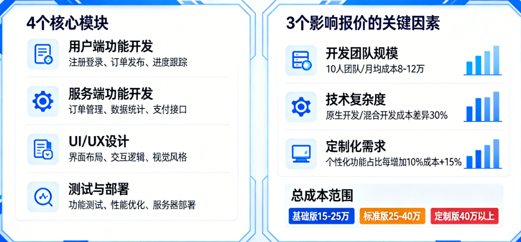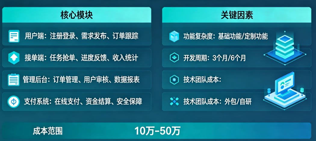 开发一款同城接单APP,其成本本质上是对业务复杂性、技术挑战性和团队专业性的货币化体现。四个核心模块构成了成本的躯体,而三个关键因素则决定了其价格的高低浮动。