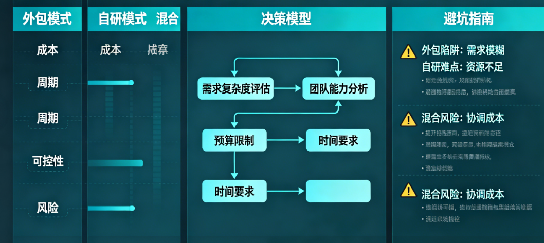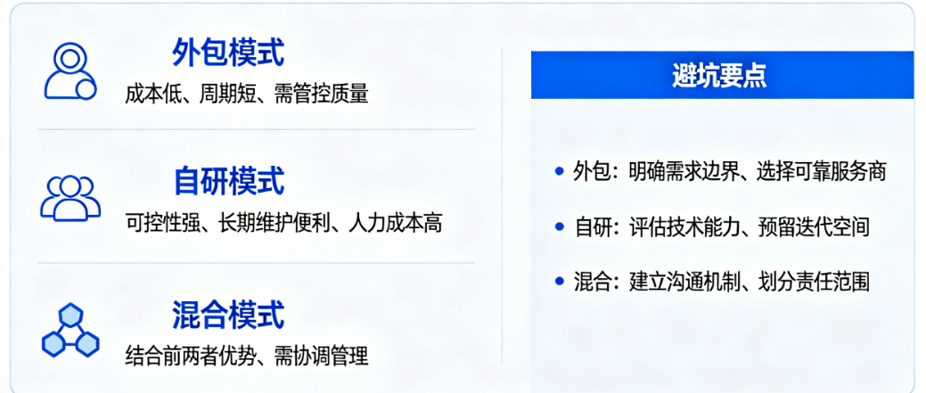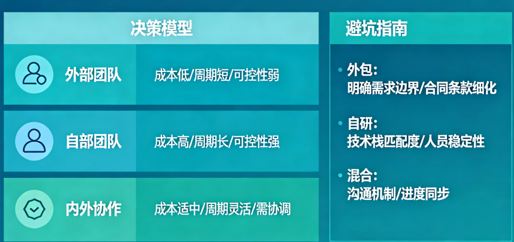 最危险的往往不是选择了某条路,而是用A模式的方法去管理B模式的项目——比如用管理自研团队的松散沟通方式去应对外包项目,或者用看待外包供应商的“甲乙方”对立心态去管理混合模式中的合作伙伴。