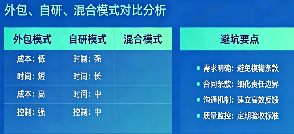 资源最优配置:将核心能力握在手中,同时利用外部资源解决峰值人力需求或技术短板。