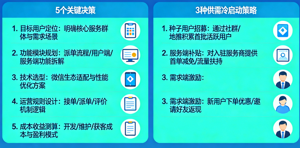 开发一个派单O2O小程序是一场马拉松,而不是百米冲刺。前期的5个关键决策决定了你的赛道是否正确,而3种冷启动策略则决定了你起跑是否稳健。最危险的时刻往往出现在上线后的头三个月——当最初的新鲜感过去,真实而残酷的市场反馈到来时。