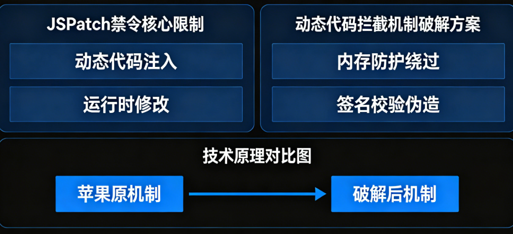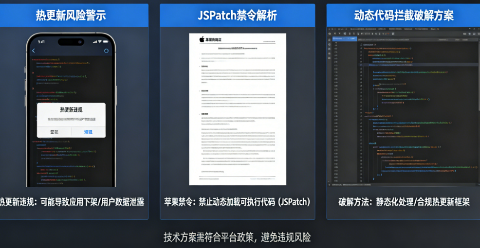 这正是所有试图“破解苹果‘JSPatch禁令’与各大商店的动态代码拦截机制”的开发者,都必须面对的原罪。 JSPatch从未被真正“破解”——因为苹果根本不是在禁一个框架,而是在禁一类行为:任何允许远程代码以不受控方式修改原生运行时行为的技术,都在禁令射程之内。那些号称“完美过审”的方案,要么是静态扫描的猫鼠游戏,要么是通过企业证书分发、从未真正面对过App Store审核铁拳的幸存者偏差。