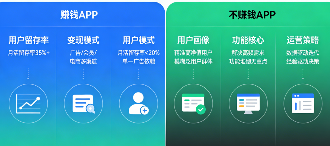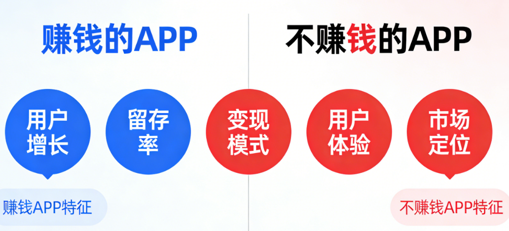 很多创业者把APP不赚钱归结为“运气不好”或者“市场竞争太激烈”。但真实原因是:从第一天起,赚钱的APP和不赚钱的APP,就走在完全不同的路上。它们在开发决策、成本控制、用户思维、变现逻辑上的差异,注定了后来的命运。