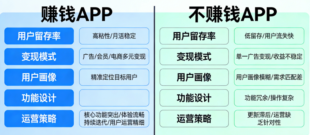 今天我们就用5个维度深度对比,看看赚钱的APP和不赚钱的APP,差别到底在哪。这5个维度分别是:开发决策与成本控制、核心功能与产品定位、用户留存与运营策略、变现模式与商业闭环、团队认知与迭代能力。每一个维度,都是生死分水岭。