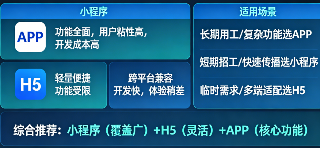 APP、小程序、H5,没有绝对的好坏,只有适合不适合。对于劳务招工平台来说,最理性的路径是:从小程序起步,快速验证市场;用H5做活动补充,低成本获客;等用户量起来后,再考虑APP深度运营。