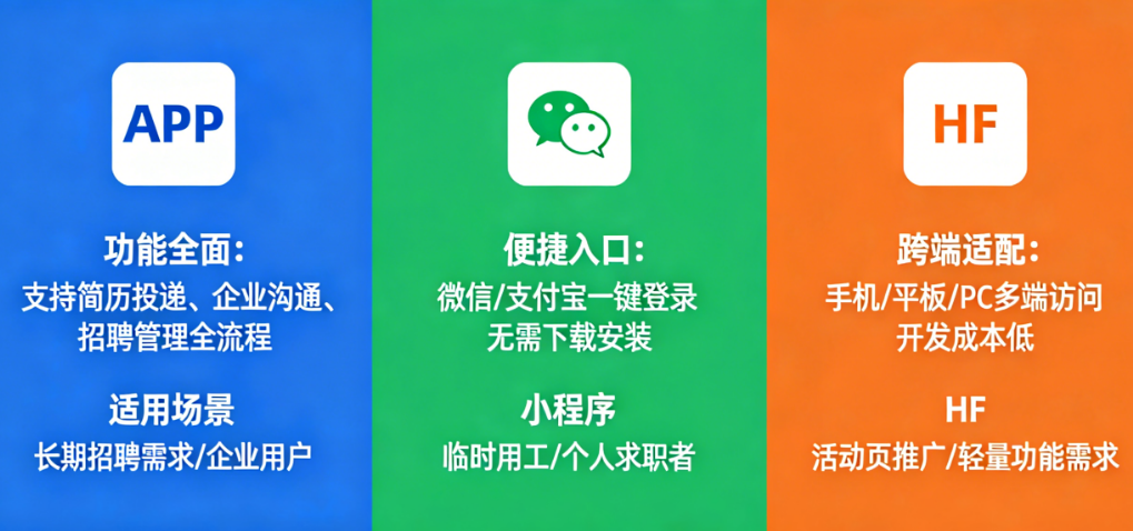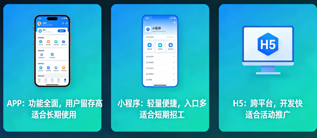 本文将用最直白的方式,拆解APP、小程序、H5三种技术形态的优缺点、适用场景和成本差异,帮你回答那个关键问题:我的劳务招工平台,到底该选哪个?