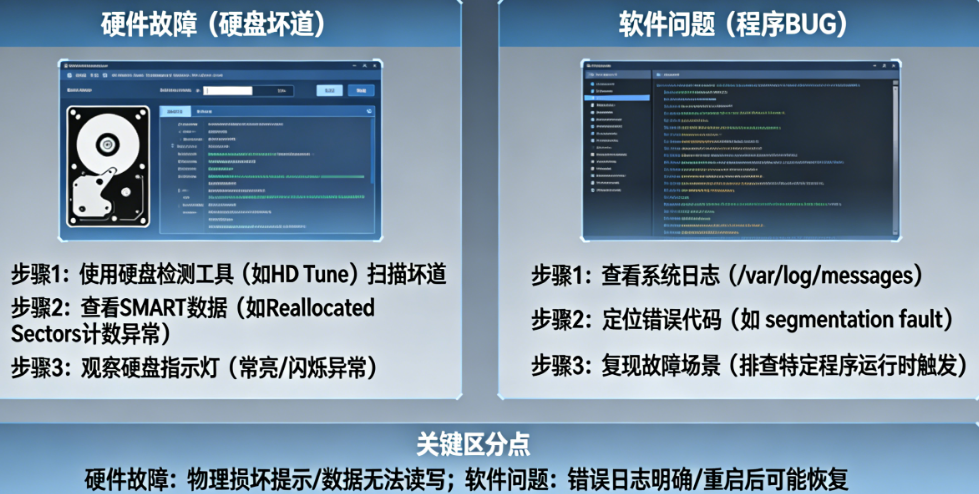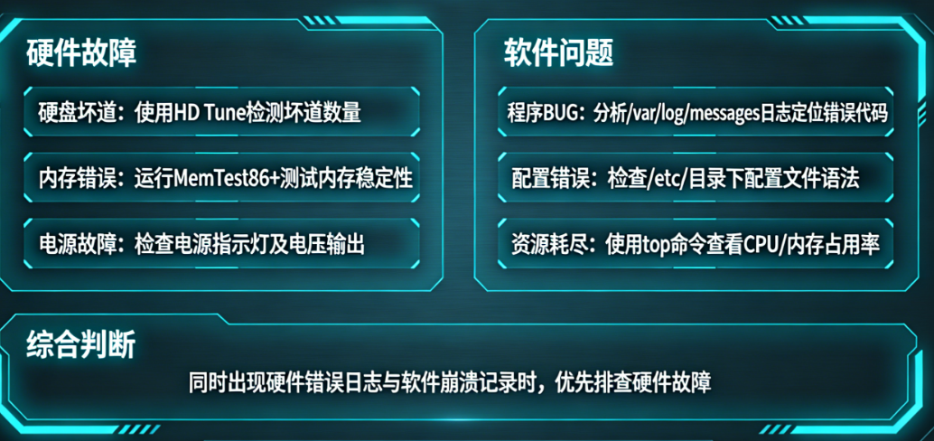 关键判断逻辑:如果系统日志中出现硬件相关的错误代码(如MCE、Medium Error),基本可以确认为硬件故障。如果只有应用层报错,而内核日志干净,则大概率是软件问题。