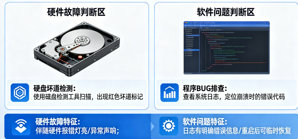 本文将提供一套系统的诊断方法论,从现象特征、日志分析、工具检测三个维度,帮你快速判断宕机根源究竟在硬件还是软件。