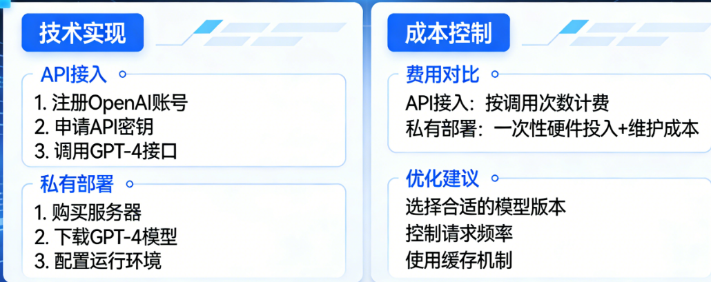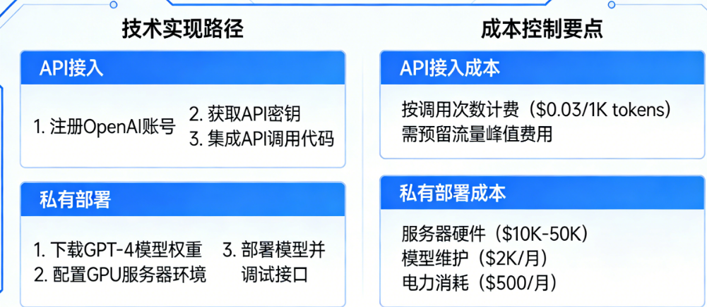 当你兴致勃勃地准备为自己的智能体接入GPT-4时,大概率会卡在第一个十字路口:到底是直接调用API,还是搞一套私有部署?调用API吧,担心网络不稳定、数据安全、长期费用不可控;私有部署吧,又怕硬件投入太大、技术门槛太高、维护起来麻烦。更让人头疼的是,网上教程要么只讲API怎么调,要么只吹私有化多安全,很少有人把两条路从技术实现到成本控制掰开揉碎了讲清楚。