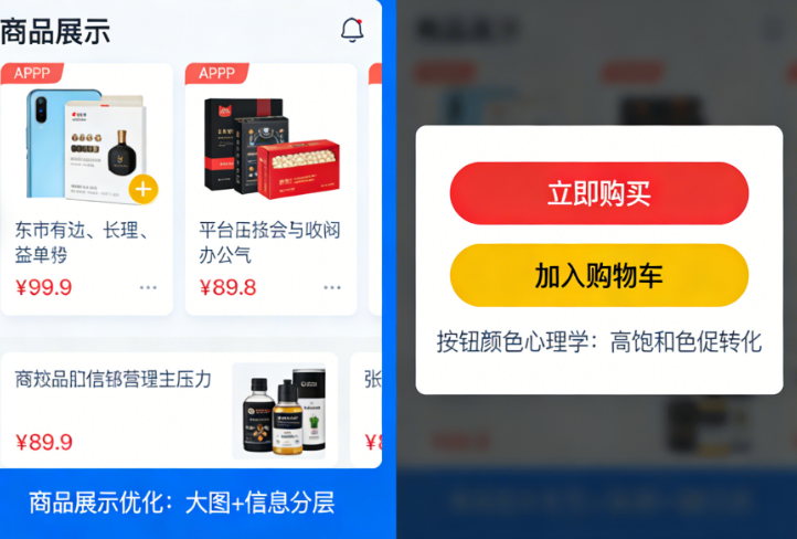 一个残酷的事实摆在所有电商从业者面前:用户下载你的APP只需要几秒钟,但让他下单,却需要跨越无数道心理门槛。界面设计从来不是“好不好看”的问题,而是“能不能让用户掏钱”的问题。很多电商APP设计犯了同一个错误——把界面当作品展示,而不是把界面当作销售漏斗。那些“带货”能力强的APP,背后都有一套精心设计的心理暗示机制:在用户犹豫时推一把,在用户注意力涣散时拉回来,在用户准备离开时制造一个无法拒绝的理由。本文将从商品展示、按钮颜色、下单动线三个核心维度,拆解电商APP如何通过界面设计系统性地提升转化率。无论你是产品经理、UI设计师,还是正在筹备电商项目的创业者,这套方法论都能直接落地。