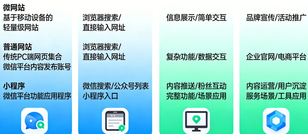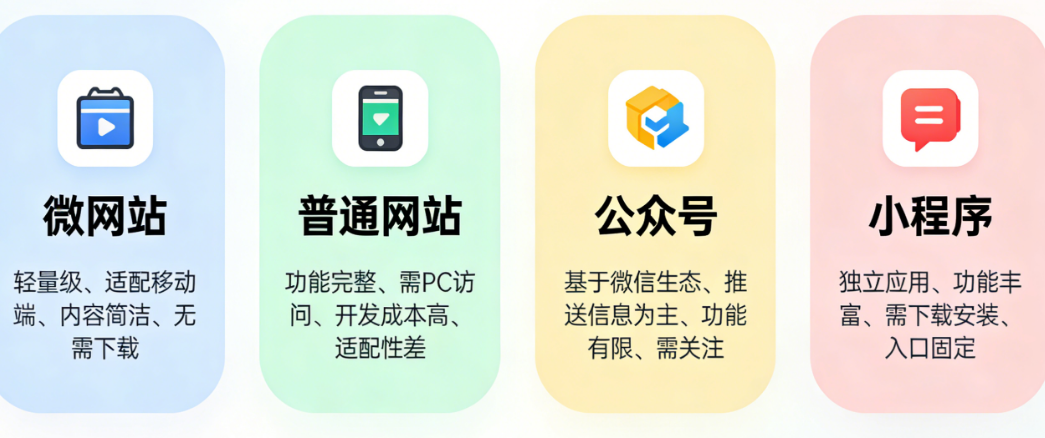 在移动互联网时代,企业的线上营销阵地变得愈发多元。当我们谈论搭建线上平台时,常常会听到“微网站”、“普通网站”、“公众号”、“小程序”这些名词。它们之间有何区别?企业又该如何选择?本文将为您一一解答。