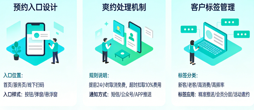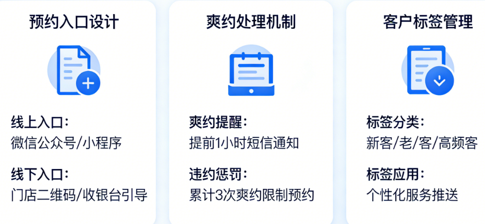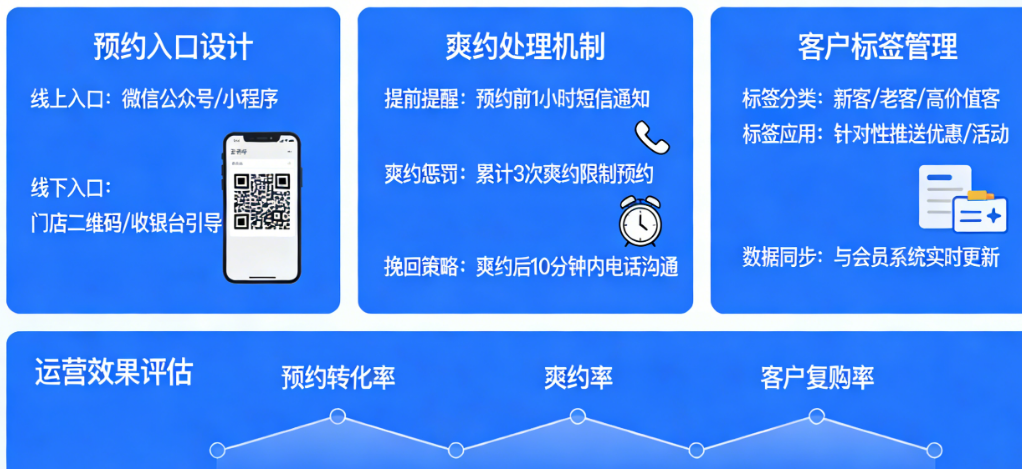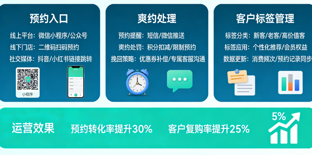 今天,我们就从预约入口布局、爽约处理机制、客户标签管理三个核心维度,为你拆解实体店预约功能的上线运营指南。这套方法不是“技术开发指南”,而是“运营实战手册”——让你花最小的投入,把预约功能真正用起来、用出效果。