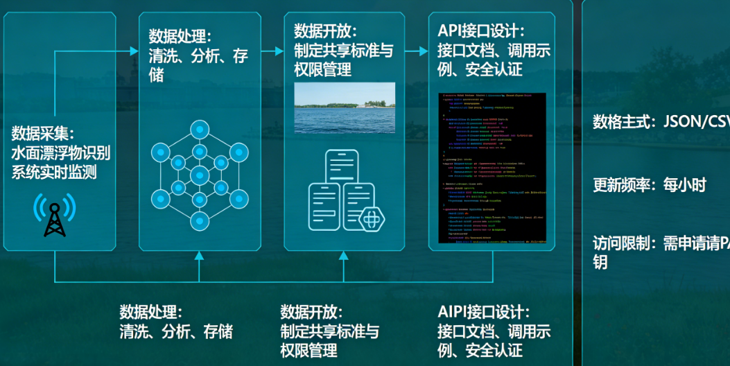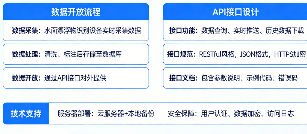 解决这个问题的核心,在于一套设计良好的数据开放体系。而数据开放的“总开关”,就是API接口——应用程序编程接口。简单来说,API就是一套标准化的“对话协议”,让不同的系统能够互相理解、交换数据,就像两个人说同一种语言一样顺畅。本文将系统拆解水面漂浮物识别系统的数据共享方案,从数据开放的标准选择、API接口的设计原则到实际落地中的安全与权限管理,帮你理清“数据怎么给出去、给谁用、怎么保证安全”的全套思路。