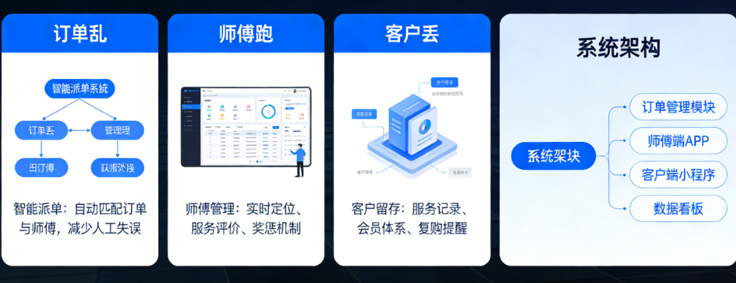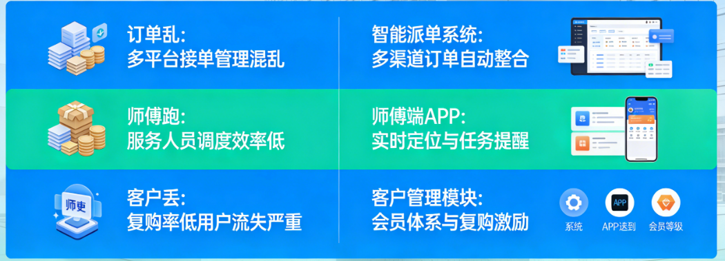 这不是个例。上门到家服务行业的从业者们,几乎每天都在被同样的三个问题折磨:订单乱、师傅跑、客户丢。订单乱体现在手工派单效率低下、服务状态不透明、财务对账困难;师傅跑表现为服务人员缺乏约束、接私单现象严重、服务质量参差不齐;客户丢则源于售后服务缺失、缺乏会员管理体系、复购率持续走低。这三个问题相互交织、恶性循环,最终让无数原本有潜力的上门服务项目胎死腹中。