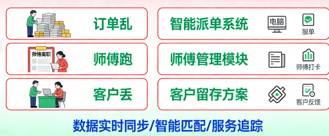 凌晨两点,你还对着手机屏幕焦头烂额——今天又有三个客户投诉说师傅没按时上门,实际上你明明已经把订单派给了师傅,但师傅转头就去接了私单。更让人崩溃的是,翻看账本发现上个月的订单记录混乱不堪,有的客户付款了却没标记,有的服务完成了却没收钱。而当你终于抽出时间想整理一下客户资料时,才发现那些老客户的联系方式散落在十几个微信聊天记录里,根本无从追溯。