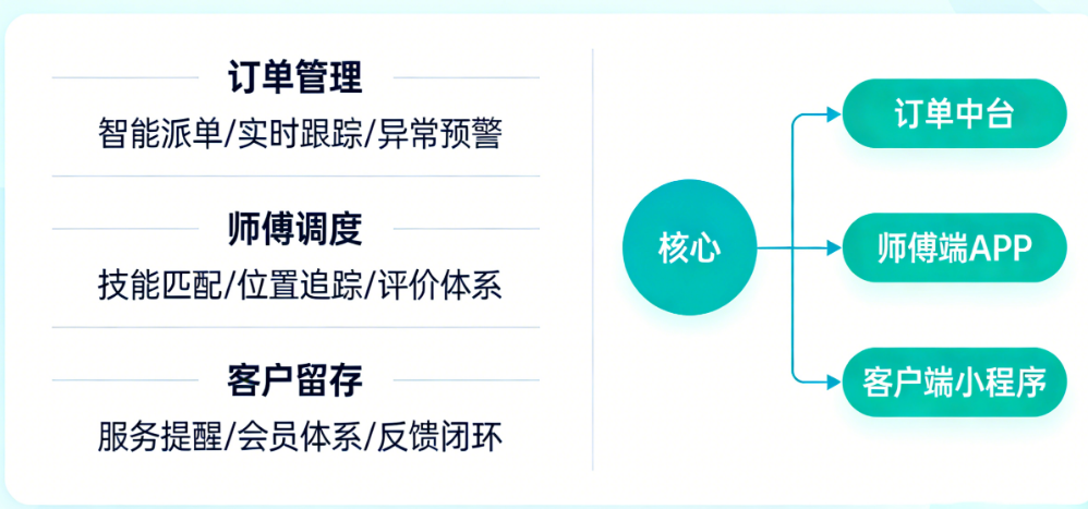 在深入了解解决方案之前,你需要先理解一套完整的上门到家系统包含哪些核心模块。订单管理模块负责从用户下单到服务完成的全部流程追踪,包括订单创建、派单调度、状态同步、结算对账等功能。师傅端模块是服务人员使用的移动应用,通常包含接单、导航、服务记录、佣金查看等功能。用户端模块是客户使用的入口,可以是微信小程序、APP或H5页面,包含服务浏览、下单支付、订单跟踪、评价反馈等功能。管理后台则是商家使用的总控平台,用于人员管理、数据统计、营销配置等。这四个模块协同工作,构成了上门到家系统的完整闭环。