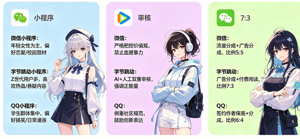 小说漫画小程序的平台选择,没有“最好”只有“最合适”。核心决策逻辑是:用户画像匹配度决定流量天花板,内容审核机制决定你的内容能否上线,分成模式决定你的收益水平。建议新手先从右豹、番茄达人中心等零门槛平台入手,跑通变现闭环后再多平台布局分散风险。记住本文的一句话:内容质量×渠道选择×持续优化,才是长期变现的核心法则。